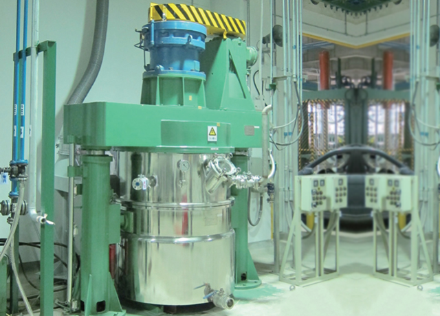 行星攪拌機(jī)是一種新型高效無死點(diǎn)混合攪拌設(shè)備,它具有獨(dú)特、新穎的攪拌形式,釜內(nèi)有兩根或3根多層漿葉攪拌器和1~2個(gè)自動(dòng)刮刀,攪拌器在繞釜體軸線公轉(zhuǎn)的同時(shí),又以不同的轉(zhuǎn)速繞自身軸線高速自轉(zhuǎn),使物料在釜體內(nèi)作復(fù)雜的運(yùn)動(dòng),受到強(qiáng)烈的剪切和搓合其效率通常為普通攪拌機(jī)的數(shù)倍。
